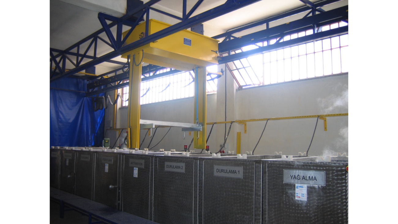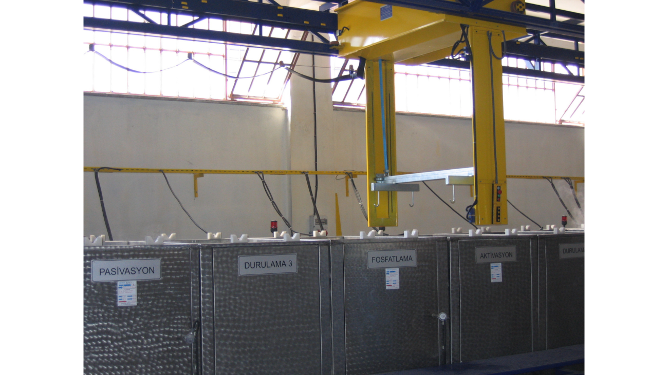 Sistem: kimyasal tankları,monoray vinç ve yüzey işlemi yapılacak parçaların içine konulduğu sepetten meydana gelir ve tank içerisindeki kimyasal madde içerisine daldırılıp proses süresi kadar bekletilme esasına dayanır. Sprey uygulamalarına göre avantajı , daldırma yönteminde malzemelerin her noktasına eşit nüfuz ederek eşit temizleme ve kaplama imkanı sağlar(profil ve boru gibi ürünlerin iç yüzeyi). Proses bitiminde malzemelerin hızlı olarak durulanması ve kurutulması gerekir.