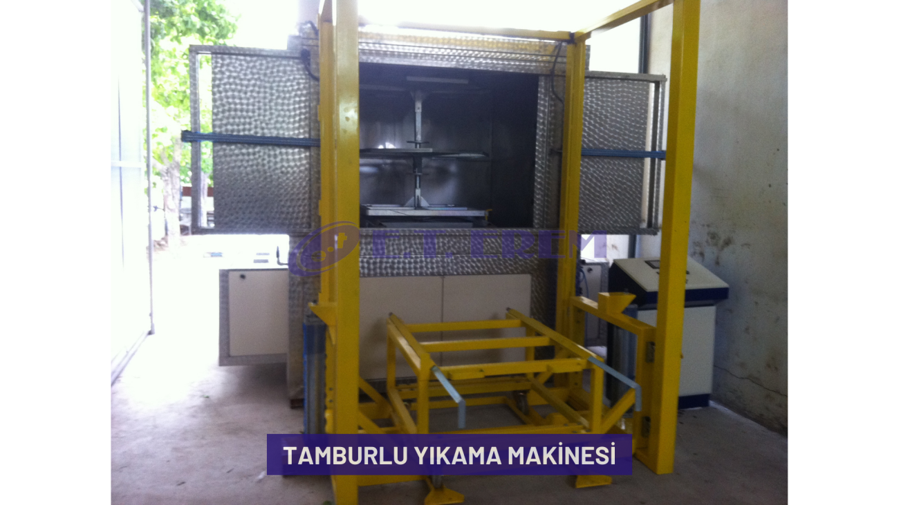 Tamburlu yıkama makinemiz düşük maliyeti ve az alan kaplaması gibi özellikleriyle öne çıkıyor. Aynı hazne içerisinde sıcak veya soğuk kimyasal uygulaması, durulama işlemi ve kurutma işlemi sırasıyla gerçekleştirilmektedir. Tamburlu yapısı sayesinde malzemeler içeride dönüş hareketi yapıyorken aynı zamanda sprey nozullardan kimyasal yüksek basınçta malzeme üzerine uygulanmaktadır. Bu sayede azami temizlik şartları sağlanmaktadır. 2 veya daha fazla kimyasal banyosuyla üretim yapılabilmektedir. Banyo ve uygulama haznesi malzemesi kullanacak kimyasala göre 304 veya 316 paslanmaz sacdan imal edilmektedir.